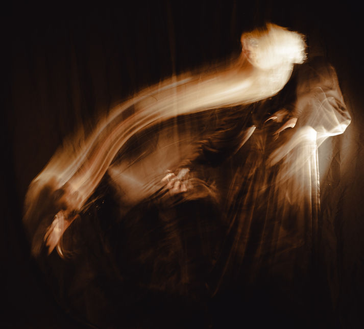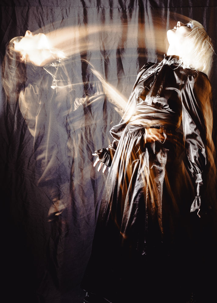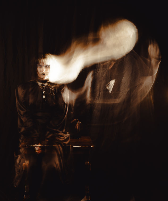 Inspired by light painting I created a practice of using motion to create ethereal dances and possessions with a single subject. I used a black background and a black dress to contrast with my pale skin and white hair that appears golden when reacting to my movement during a long exposure and the bright yellow light of the camera flash.